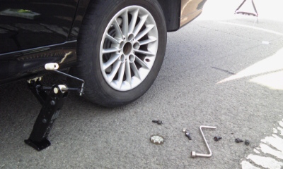 写真の通り、タイヤ交換に悪戦苦闘30分。 タイヤさん嫌がりピクリともせず、車屋さんにTEL。 待つ事30分。 車屋さんが到着し、車体の下にもぐり、タイヤを思いっきり蹴ったくる事数回。 タイヤが外れ、直ぐにタイヤ交換完了!! タイヤ交換は何度かした事がありますが、 車体の下にもぐって思いっきりタイヤを蹴った事はありませんでした(:_;) 流石はプロ!! \(^o^)/