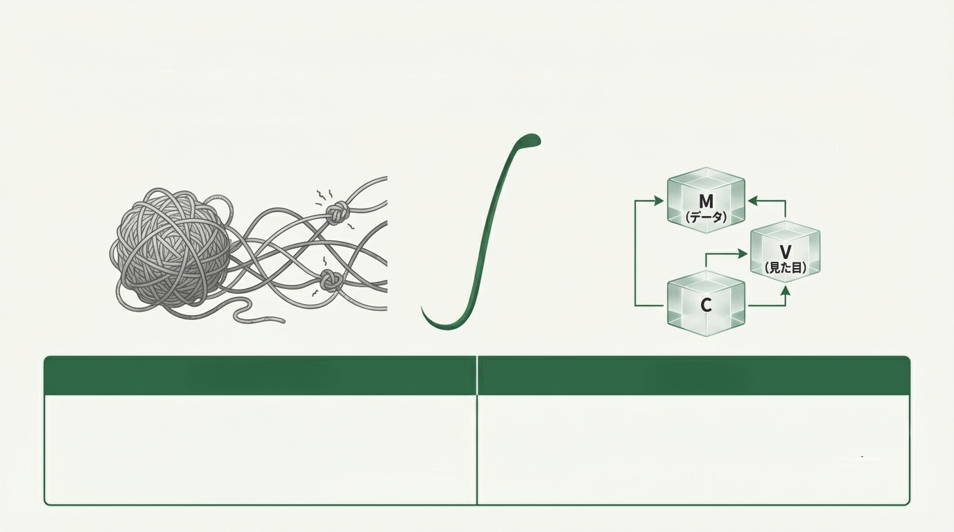 画面の見た目 (View) と裏側の計算 (Model) が分離されているため、「新しい決済方法を追加したい」「画面デザインを変えたい」という将来の要望に対し、システム全体を壊すことなく迅速かつ低コストで対応可能。