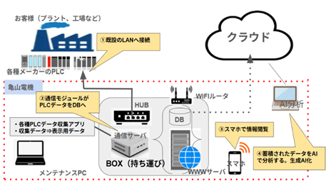 工場内のPLC等からデータをデータベースに取込み、スマホを用いて情報を確認できる様にする。その際、メモアプリを活用し付加情報を添付する。それらのデータや既存のマニュアル、現場の知識をナレッジ化し、生成AIエージェントにて情報(トラブル情報、対処手順など)を確認する。